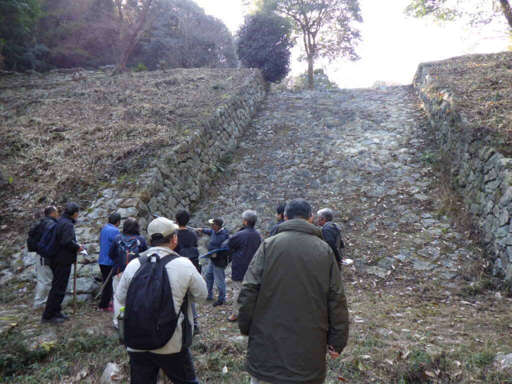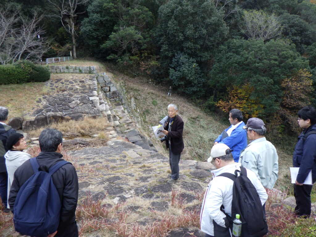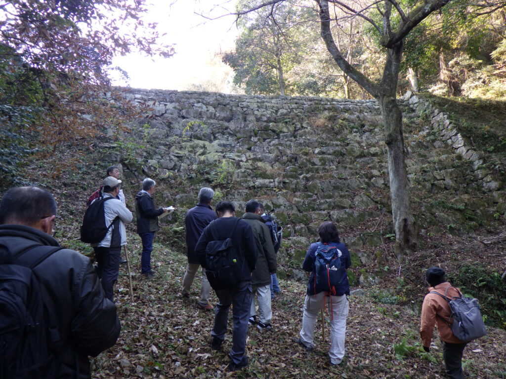 「別所砂留」では最大堰堤高18mにも及ぶ大迫力の石積砂防堰堤を見学しました。城郭石垣に通じる日本独自の高度な石積技術や地質特性を生かした石材選定、長年に渡る補修改築の歴史などを学びました。