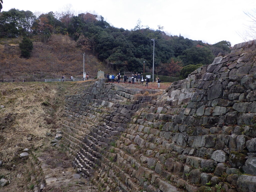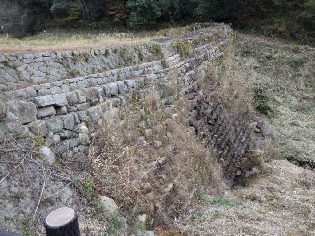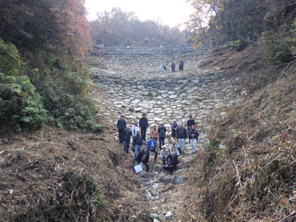 「堂々川砂留」では最大堤長55.8mにも及ぶ幅広く大規模な石積砂防堰堤を見学しました。堂々川や上流の大原池(灌漑用ため池)の治水・農地保全に大きな役割を果たしていることを知り、砂防事業の大切さを感じました。