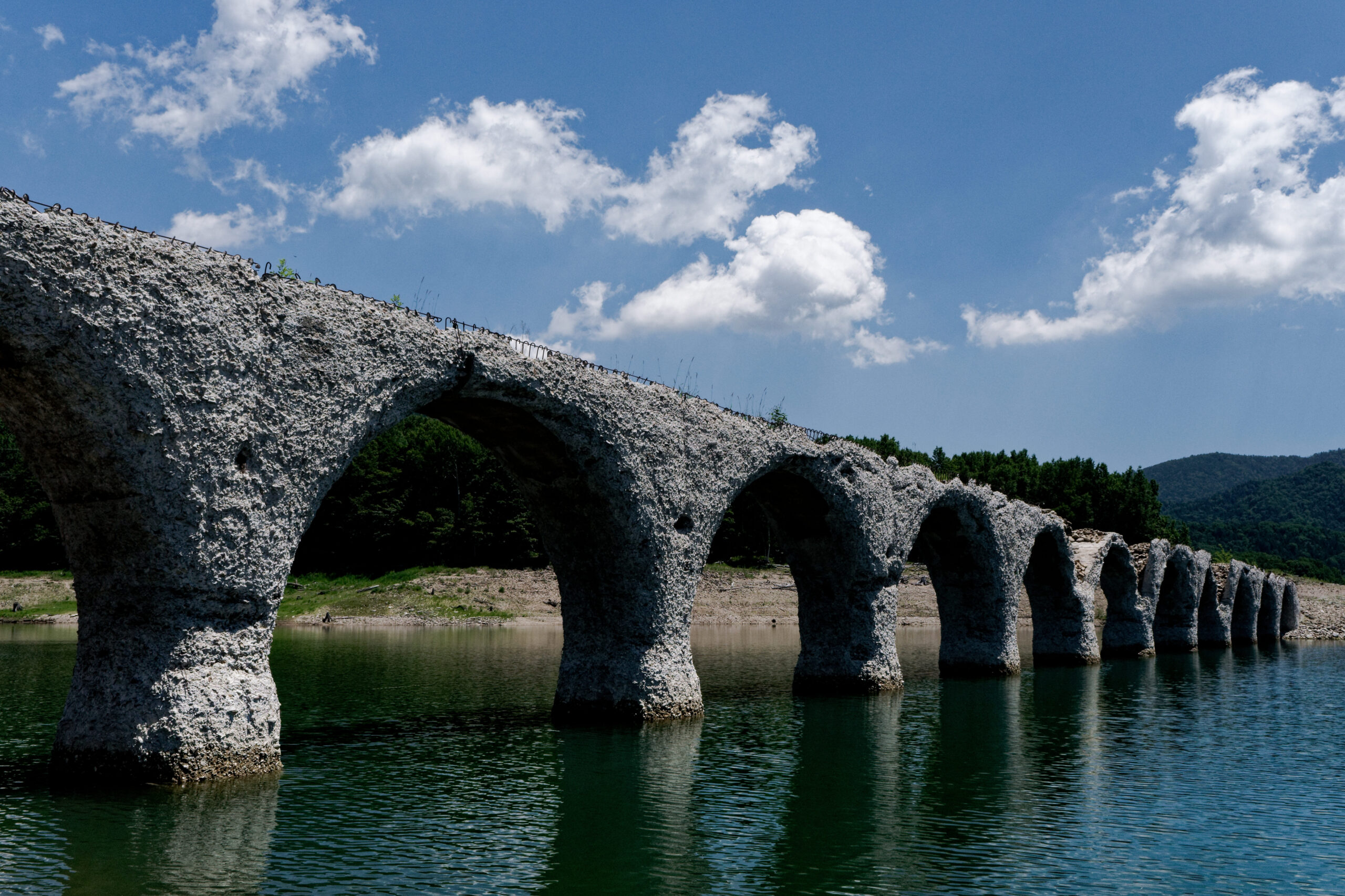 | 審査員コメント | 糠平ダムの完成により湖底に沈んだ「幻の橋」を捉えた一枚です.かなり老朽化が進んでいるものの,当時の土木技術の高さを今に伝える美しい姿をとどめています.湖面にたたずむ儚くも重厚なアーチと爽やかな青空の対比が印象的な作品です. |