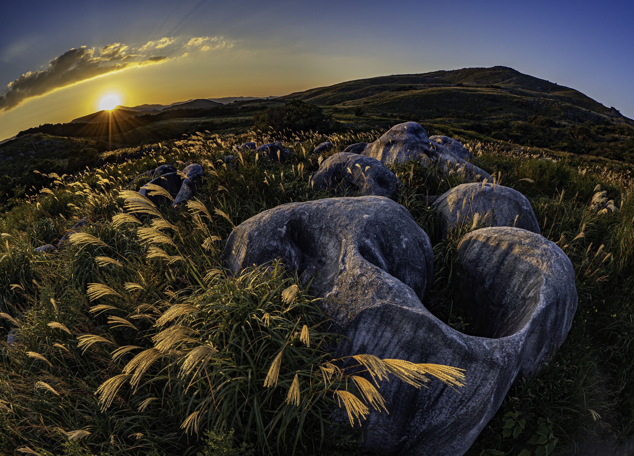 | 審査員コメント | 夕暮れの光に照らされ,美しく輝く羊群原の瞬間を見事に捉えた一枚です.夕焼けに染まる石肌と一面のススキが織りなす情景は静謐かつ神秘的で,自然の息吹と時間の移ろいを感じさせる素晴らしい作品です. |