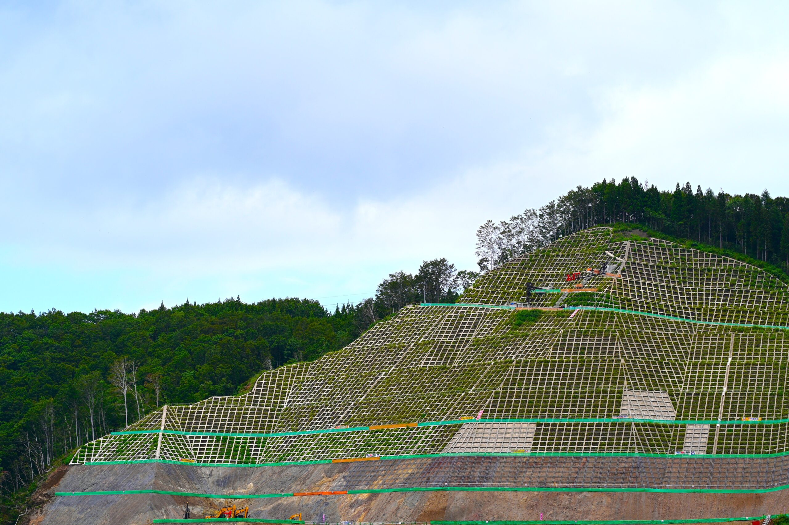 | 審査員コメント | 雄大な自然と人の営みが交差する瞬間を的確にとらえた作品です.山肌を覆う法面工の規則的な直線が,周囲の深い緑や広い空と美しい対比を生み,土木構造物の機能美と風景の調和を印象的に表現されている作品です. |