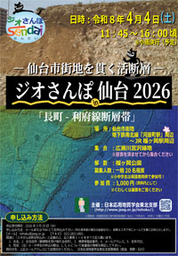 ○『ジオさんぽ仙台2026』 日 時:令和8年4月4日(土) 場 所:仙台市街地(地下鉄南北線「河原町駅」周辺~JR「榴ヶ岡駅」周辺) テーマ:-仙台市街地を貫く活断層-「長町-利府線断層帯」 詳しい内容はこちらから ※一般の方(非会員)の参加大歓迎!!! ○令和7年度 現地研修会 日 時:令和7年10月24日(金) 場 所:荒砥沢ダム崩壊箇所 内 容:周辺露頭見学、荒砥沢ダムコア観察 案内者:髙嶋礼詩氏(東北大学) →参加申し込みはこちら →当日の様子 ○令和7年度 第30回支部研究発表会 日 時:令和7年8月1日(金) 場 所:せんだいメディアテーク 7F スタジオシアター 特別講演講師 : 髙嶋 礼詩 氏 (東北大学総合学術博物館 教授) →研究発表会参加申込および発表募集!! →発表プログラム →当日の様子! ○令和7年度 支部総会・特別講演会 日 時:令和7年5月16日(金) 13:00~ 場 所:せんだいメディアテーク 7F スタジオシアター →開催のご案内 →当日の様子 総会資料は下のバナーをクリックしてください ○『ジオさんぽ2024in多賀城』 日 時:令和6年11月16日(土)開催 場 所:多賀城周辺 ※一般の方(非会員)の参加大歓迎!!! ・参加者募集 無事終了いたしました ・当日の様子 ○令和6年度 現地研修会 日 時:令和6年10月25日(金)~26日(土) 場 所:秋田県にかほ市方面 内 容:象潟地震の隆起、ジオパーク、鳥海山などを予定 ・現地研修会参加者募集 →中止 ○令和6年度 第30回支部研究発表会 日 時:令和6年7月18日(木) 10:00~16:40 場 所:せんだいメディアテーク 7F スタジオシアター ・開催のお知らせと発表論文募集 ・発表プログラム ・当日の様子 ○令和6年度 支部総会・特別講演会 日 時:令和6年5月17日(金) 13:00~ 場 所:せんだいメディアテーク 7F スタジオシアター →支部総会が無事終了いたしました。 当日の様子はこちらから WEB参加者は、下記バナーより総会資料をダウンロード願います。 ○令和5年度 現地見学会 日 時:令和5年10月7日(土) 場 所:男鹿半島方面 見学地:見学地:男鹿半島方面(寒風山~安田海岸~入道崎着~鵜ノ崎を巡り、地形、地質を観察予定) → 当日の様子はこちら ○令和5年度 日本応用地質学会 研究発表会 (秋田大会) 本部の関連サイトはこちら 日 時:令和5年10月5日(木)~6(金) 場 所:あきた芸術劇場 ミルハス ○令和5年度 支部総会・技術講習会 日 時:令和5年5月19日(金) 11:00~ →内容はこちらを参照ください →当日の様子はこちら WEB参加者は、下記バナーより総会資料をダウンロード願います。 ★★過年度活動報告へ★★ |